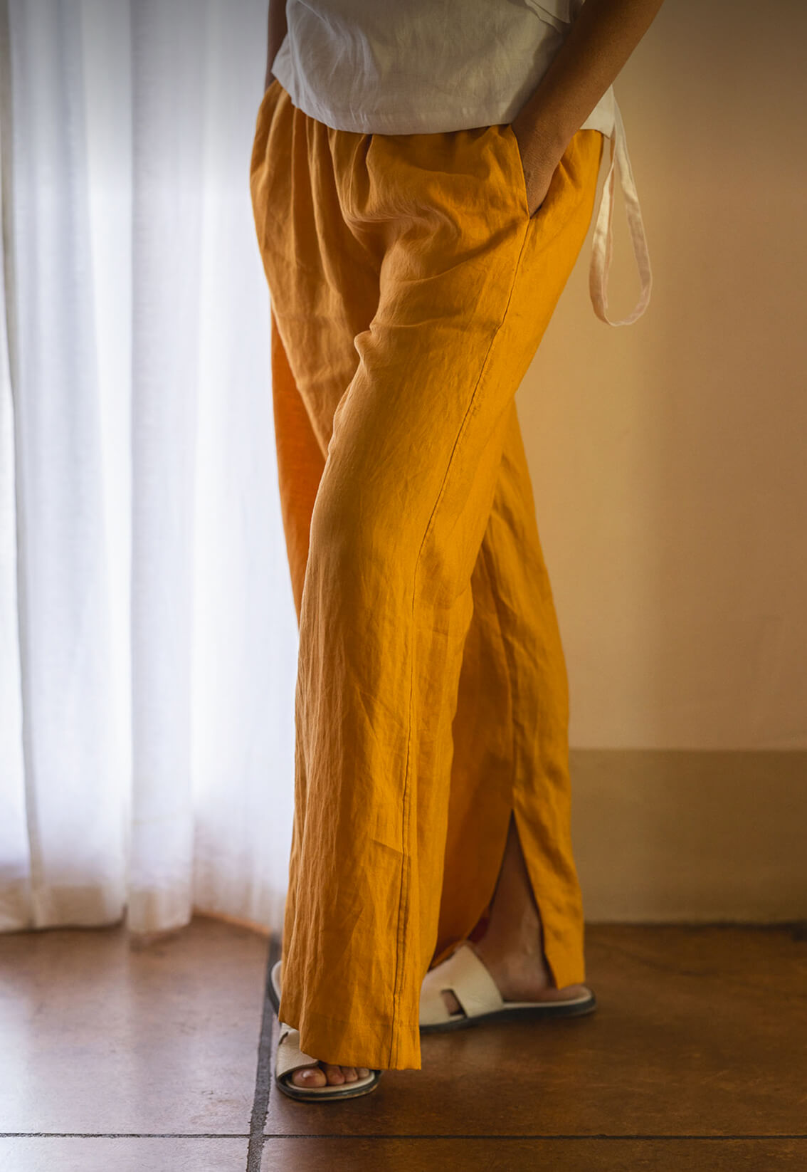 Linen pants designed for real life: flattering through the waist, easy through the leg, and made to move. Frayed hems, classic & shorts.