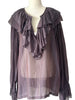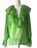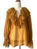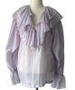 Waterfall ruffles to a deep neckline, or close up with the tiny loop button. Oversized puff sleeve with frill cuff which folds and rolls, only in voile or cotton silks for the ultimate in wisp.