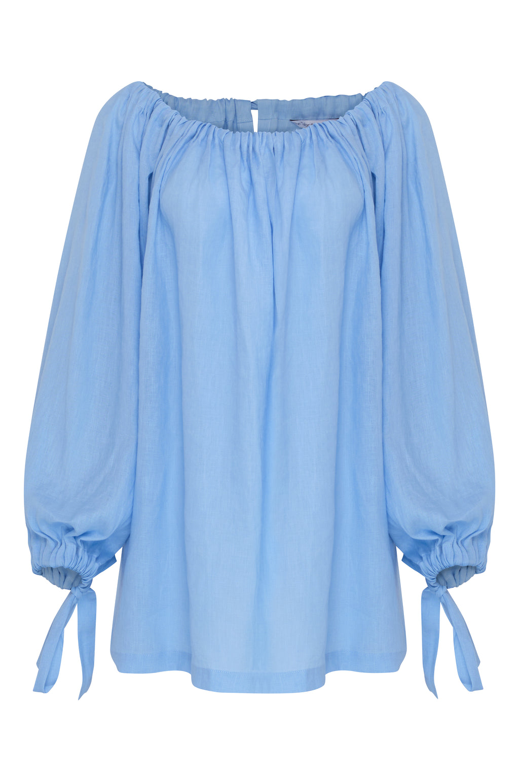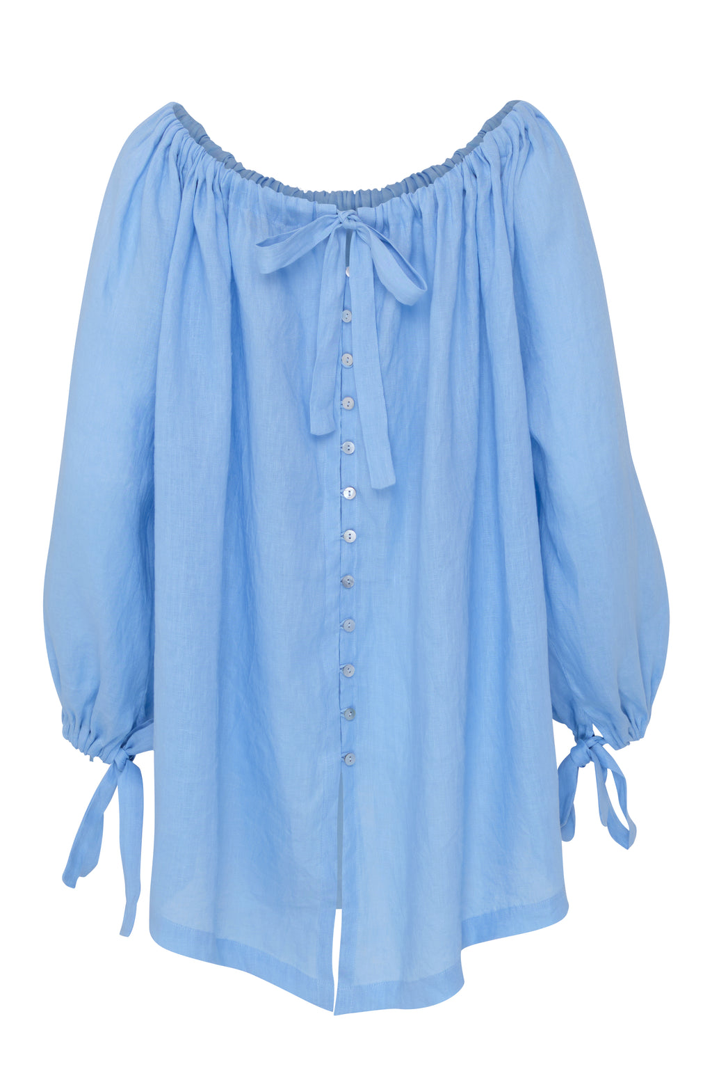 This relaxed, oversized top is your new wardrobe essential. The adjustable drawstring neckline gives you endless styling options—wear it off-shoulder, as a boat neck, or classic round. Reversible shell and loop buttons mean two looks in one piece. Three-quarter sleeves feature deep hems with ties for extra detail, while the longer back hem pairs beautifully with pants or layered over a skirt. Versatile, comfortable, and perfect for effortless summer style.