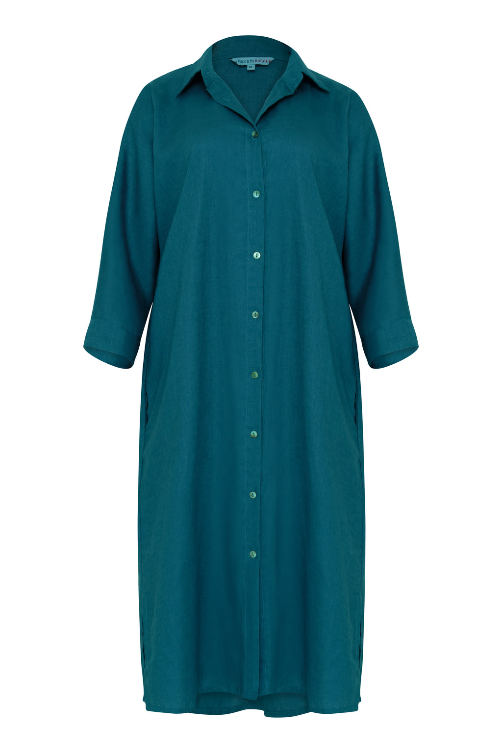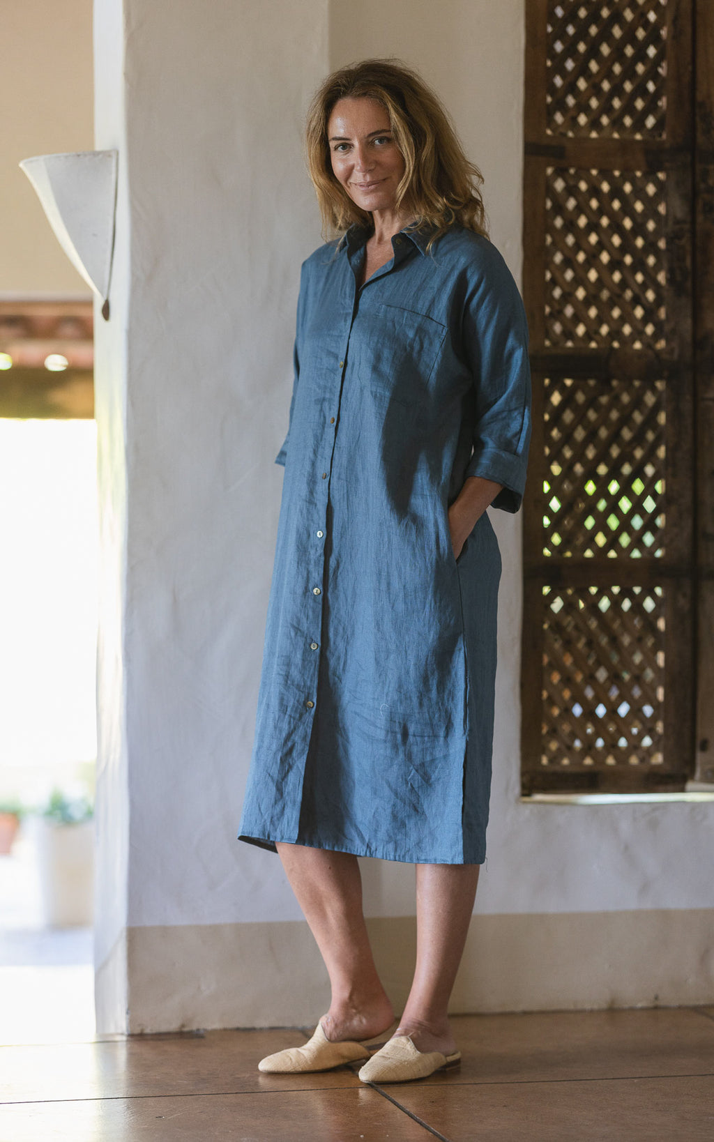 Effortless linen shirt dress that does it all. Loose fit, mid-calf length with side pockets and a clever side opening. The three-quarter sleeves roll up perfectly for warm days. Breathable and comfortable, it transitions seamlessly from casual to dressed-up—pair with sneakers or sandals depending on your mood. Your new summer essential.