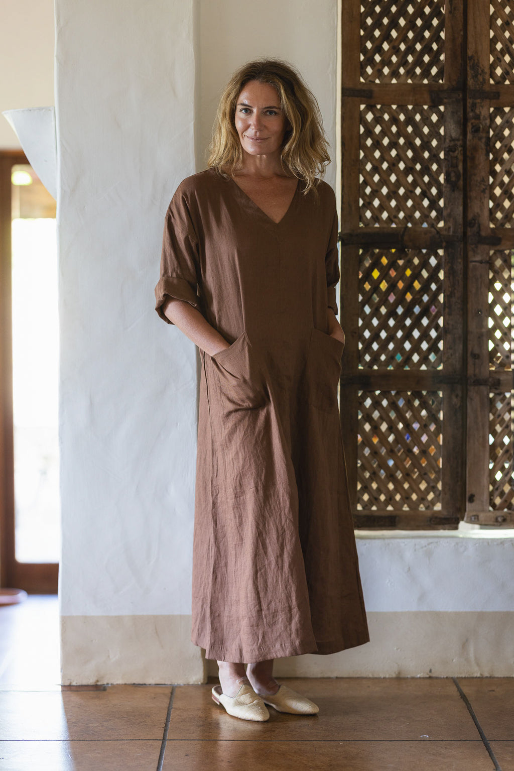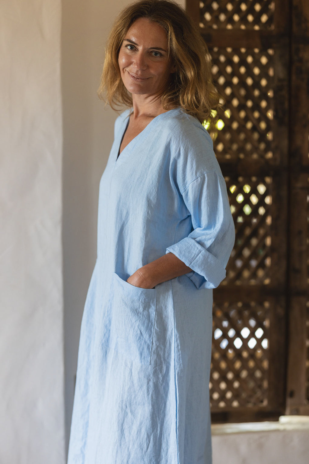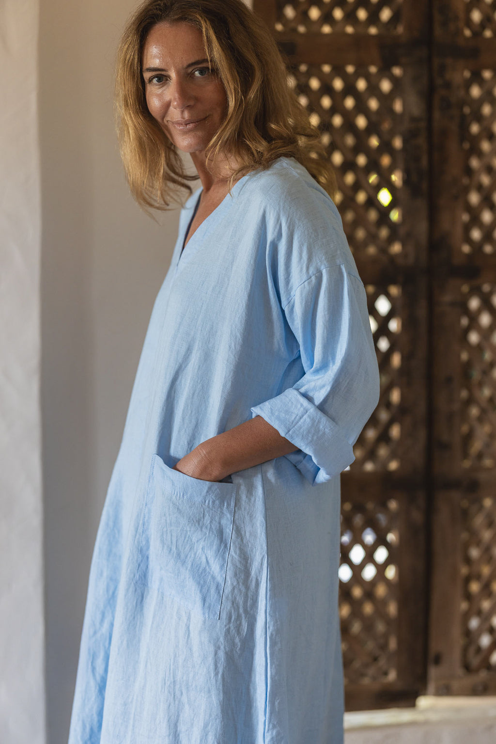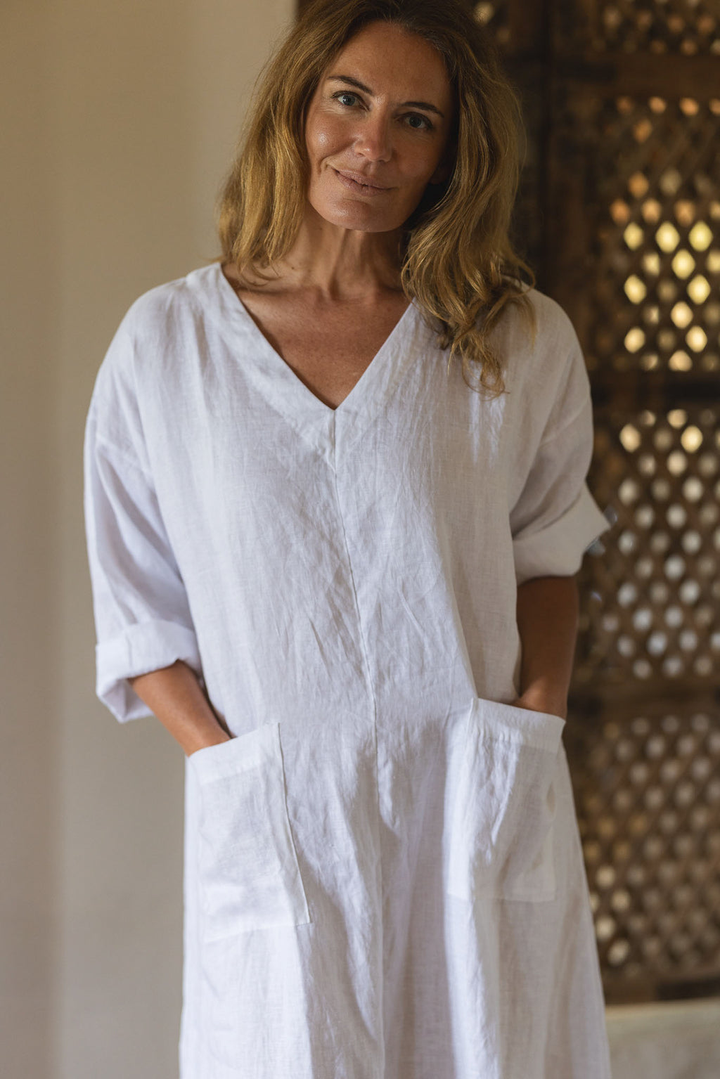 The Sun Frock redefines summer dressing with its loose, luxury linen fit and bold deep hem. Featuring an interfaced V-neck, roll sleeves, and practical front pockets, this dress combines edgy design with effortless comfort. Whether you dress it up to turn heads or throw it on for a confident, casual look, the Sun Frock is your fearless go-to for every summer occasion.