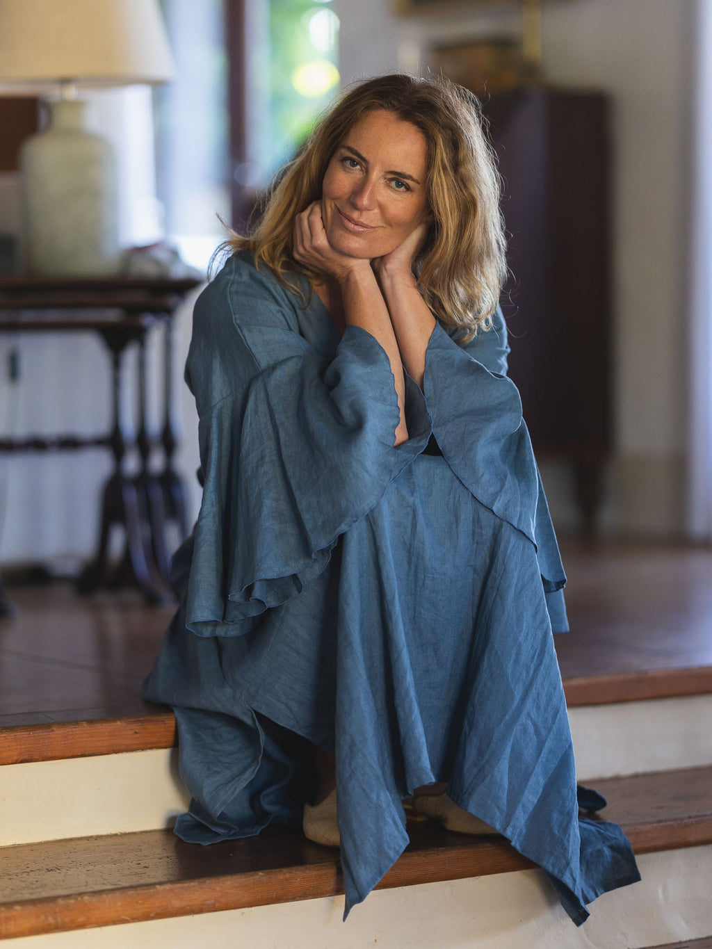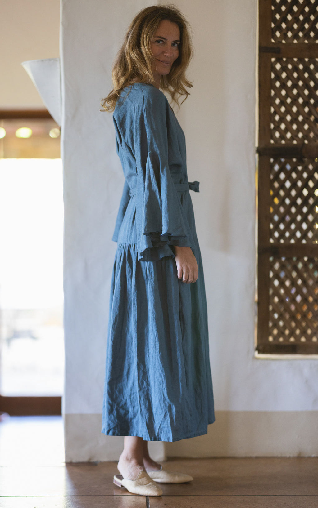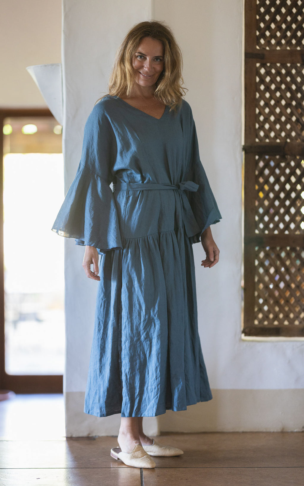 Effortless elegance meets playful movement in this statement dress. The flattering V-neckline and voluminous swing sleeves create a relaxed, editorial look, while strategic darting at the front and a dropped-hip skirt provide subtle shaping. Side splits offer ease and flow, and the self-tie belt lets you cinch the waist exactly how you like it. Perfect for those days when you want to feel put-together without trying too hard.