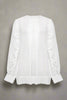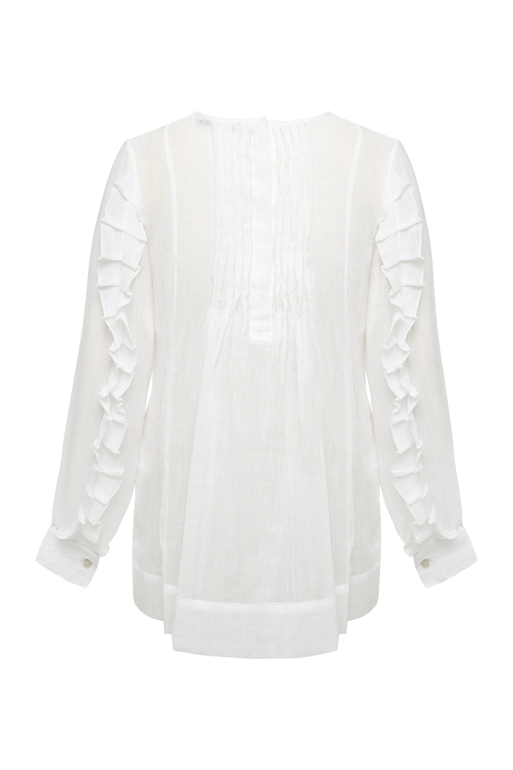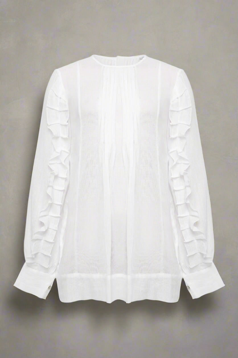 Sheer, wispy Muslin & ruffles are the ultimate combo. This shirt features fine detailing, baby pleats and shell buttons at the back, side pockets of course. Deep wide hem with plenty to tuck.