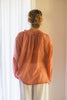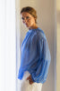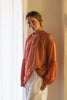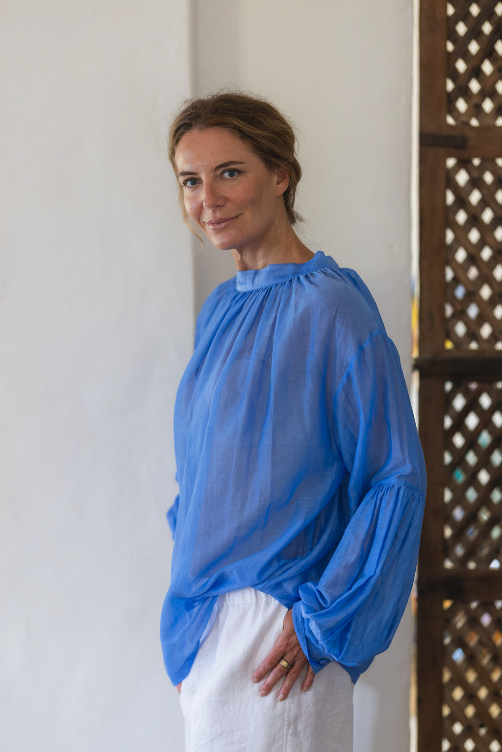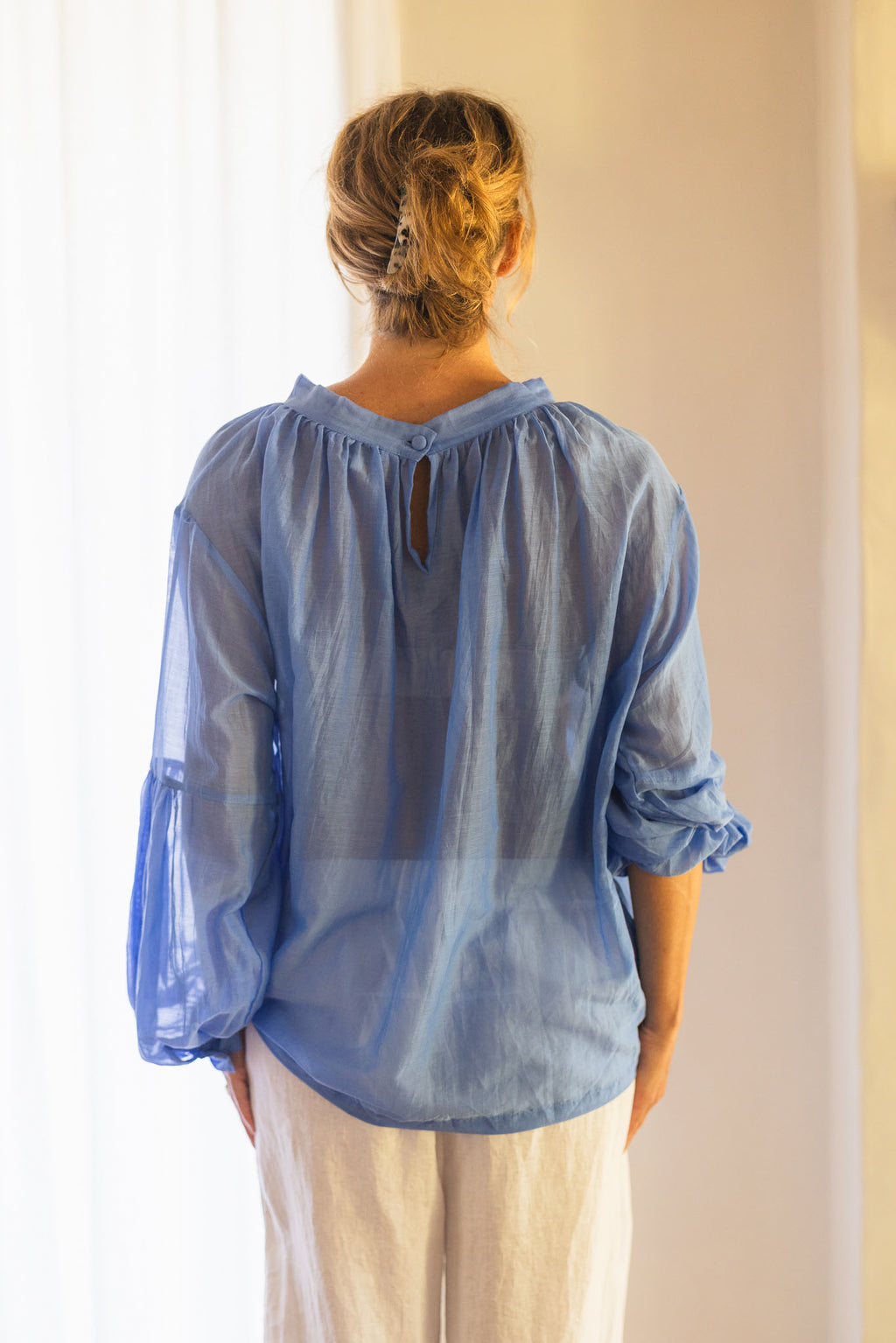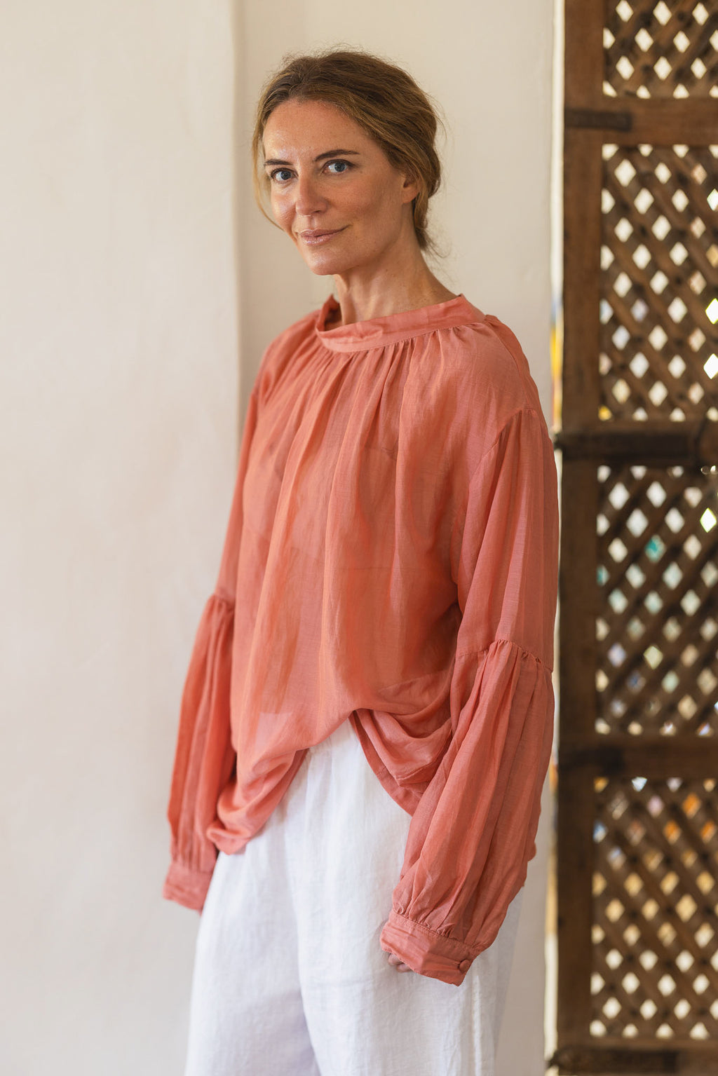 Fine Muslin or Cotton Silk with wider neck top loose fitting with extra long sleeves that are fuller from elbow, roll them, tuck the shirt or leave long. Wear either way around -Flattering on all.