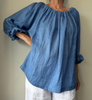 This relaxed, oversized top is your new wardrobe essential. The adjustable drawstring neckline gives you endless styling options—wear it off-shoulder, as a boat neck, or classic round. Reversible shell and loop buttons mean two looks in one piece. Three-quarter sleeves feature deep hems with ties for extra detail, while the longer back hem pairs beautifully with pants or layered over a skirt. Versatile, comfortable, and perfect for effortless summer style.