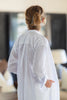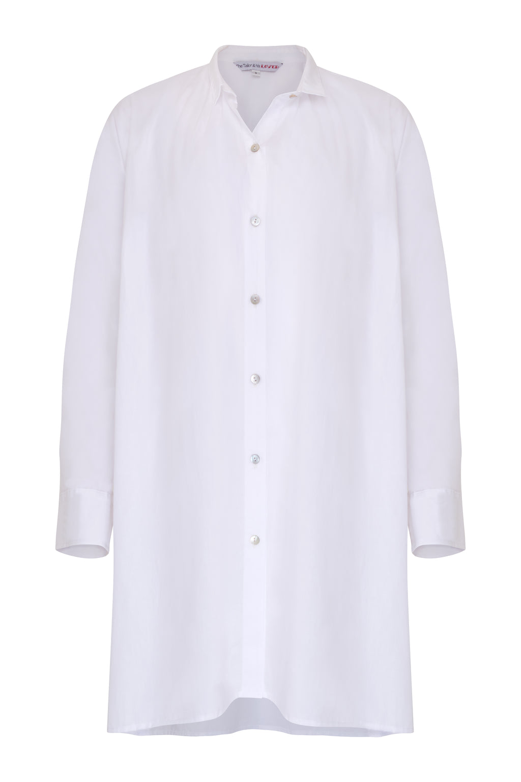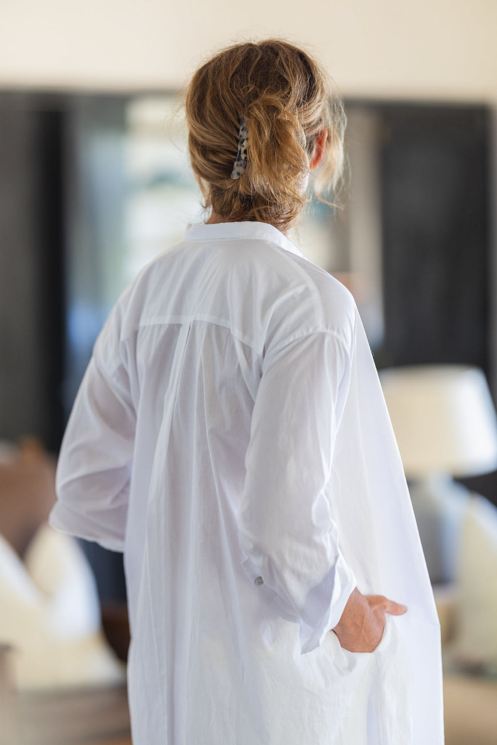 The Smock Me Not is an elegant oversized longline quintessential white shirt meticulously crafted with a bias cut to flatter everyone. Featuring a refined small collar & long cuffed sleeves designed for effortless rolling, it adds a versatile touch of sophistication to any ensemble. Thoughtfully equipped with essential side pockets, this shirt combines functionality with timeless style. Made from superb crisp white cotton, it offers a fresh, breathable feel and a pristine finish. Whether paired with tailored shorts, flowing skirts, or classic pants, or styled as a chic cover-up over swimwear, it embodies refined sophistication and effortless grace for the discerning wardrobe.