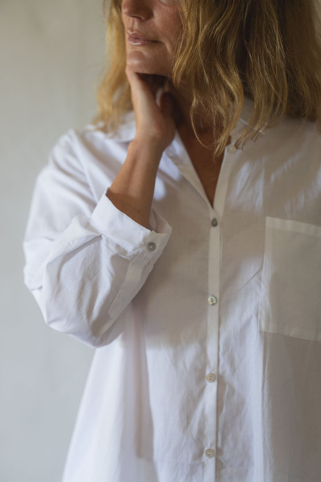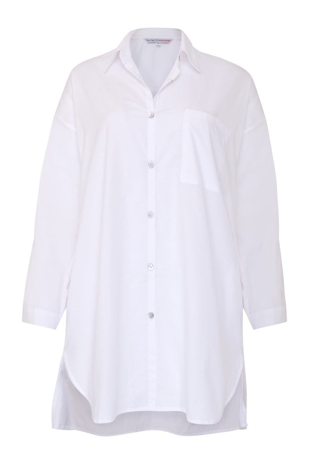 Crafted entirely from crisp, pure cotton, this relaxed shirt strikes the perfect balance between laid-back comfort and polished structure. Its generous length, practical side pockets, and subtle slits create an understated sophistication, while the compact collar keeps things refined. Roll the sleeves for an effortless vibe, or wear it tucked for a sharper look—either way, it's a versatile white essential with undeniable character.