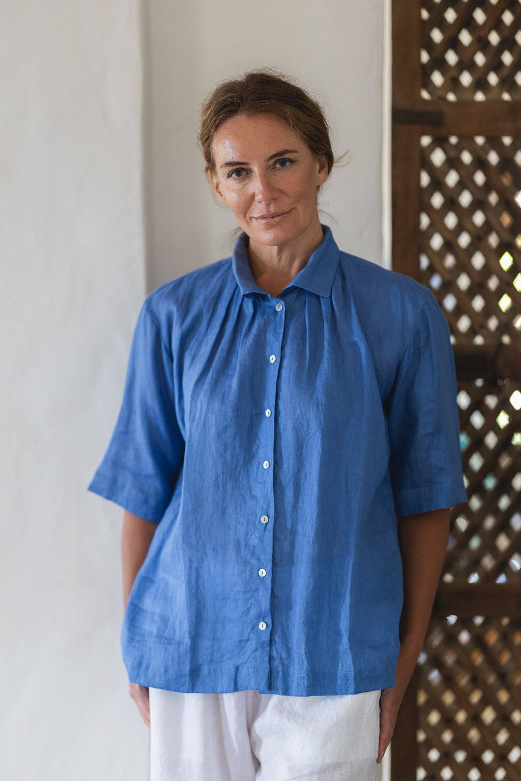 The Tiny Tuck Shirt offers an elegant, timeless design with elbow-length sleeves and a refined boxy shape. Delicate tiny tucks at the neckline provide subtle sophistication, perfect for a classic wardrobe. Wear it tucked for a polished silhouette or loose for relaxed elegance, making it a versatile addition to your collection.