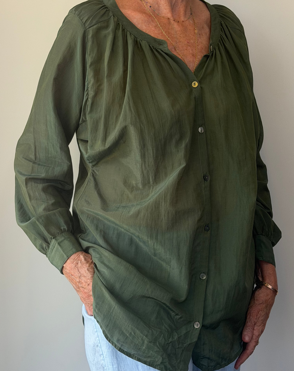 Oversized yet fitted on shoulder this long line 'blouse' is the perfect summer piece. Tiny shell buttons at front & on narrow cuff & light as a feather. Wear casually with rolled sleeves - loose or tucked, cleavage or not. Our obsession with gorgeous cotton silk in our exclusive Tailor's dyed colours ensures it can be worn cool in summer and equally wearable with a cami in colder weather.