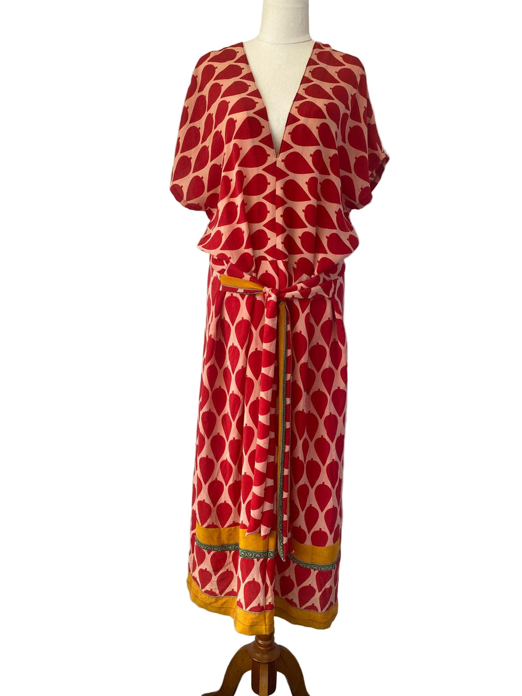Simple V neck with double side ties to loop, knot or hang loose. Back slit for ease of wear. Brilliant dress for any occasion, dress up or down as needed & ideal for travel.