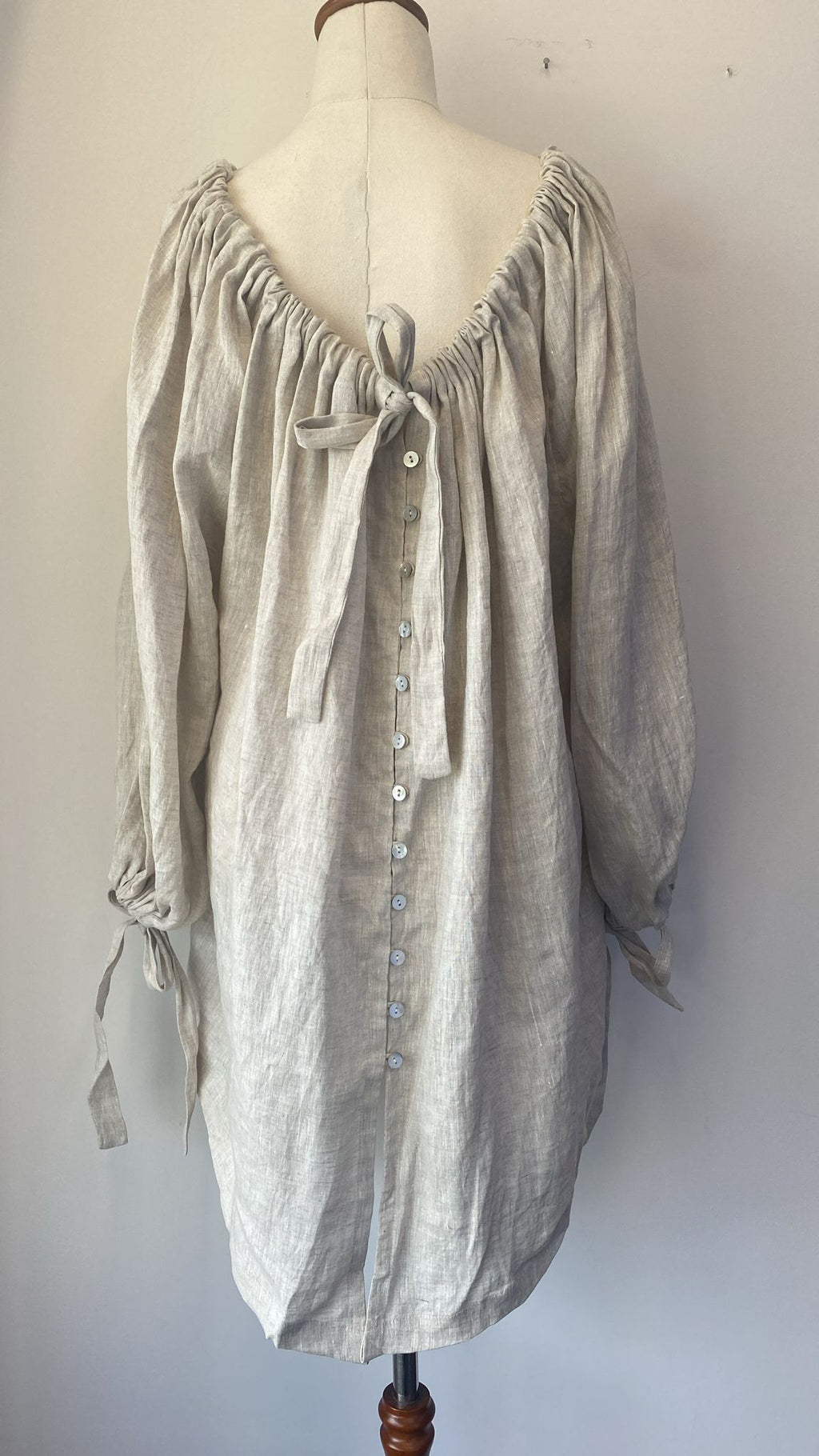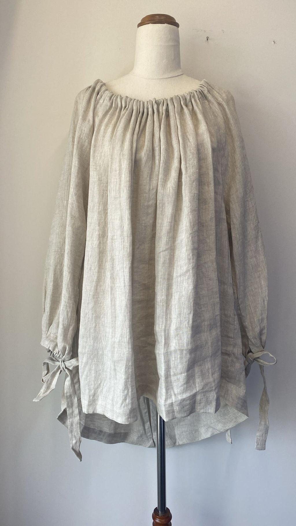 This relaxed, oversized top is your new wardrobe essential. The adjustable drawstring neckline gives you endless styling options—wear it off-shoulder, as a boat neck, or classic round. Reversible shell and loop buttons mean two looks in one piece. Three-quarter sleeves feature deep hems with ties for extra detail, while the longer back hem pairs beautifully with pants or layered over a skirt. Versatile, comfortable, and perfect for effortless summer style.