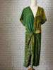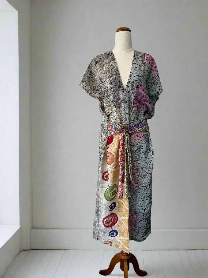 Simple V neck with double side ties to loop, knot or hang loose. Back slit for ease of wear. Brilliant dress for any occasion, dress up or down as needed & ideal for travel.